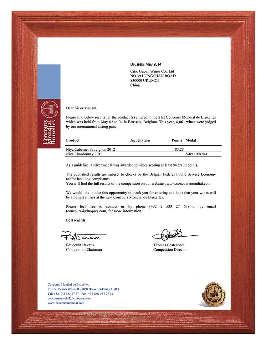 日前,中信国安葡萄酒业(以下简称:中葡酒业)旗下尼雅葡萄酒品牌,获邀参加“2014布鲁塞尔国际葡萄酒大赛”(Concours Mondial de Bruxelles 2014),该大赛是国际上最权威的四大葡萄酒大赛之一,“尼雅霞多丽干白葡萄酒珍藏级”荣膺大赛银奖。